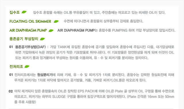 세척기의 오일제거 / 절삭장비의 오일제거 / OIL SKIMMER의 용량이 적은곳 / 가공공장, 열처리공장 / PRESS 공장 |