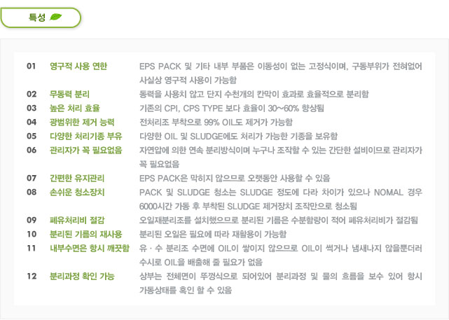 SLUDGE와 OIL이 함께 나오는곳 / 비중이 물과 비슷한 OIL을 분리하는곳 / 절삭유나 세척수의 계속 사용을 위한곳 / SLUDGE 제거 효과를 위해 고분자응집제등의 화학약품을 사용해야 하는곳 |