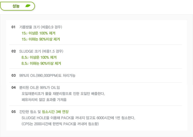 유.수 혼합물의 OIL함량 90%를 5PPM 이하로 분리 |